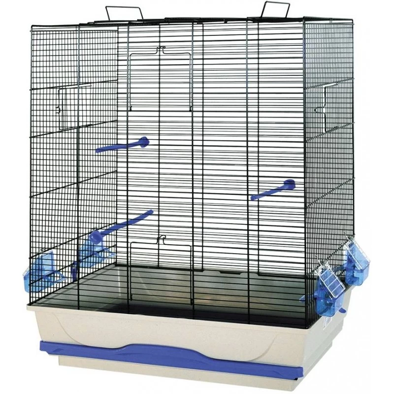 Cage oiseau incluant des perchoirs et mangeoires en plastique.