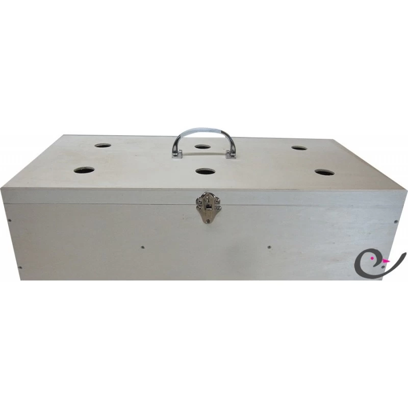 Cageot en bois trois compartiments, avec poignée de transport. Aération prévue. Grille noire avec trois portes à ressort.