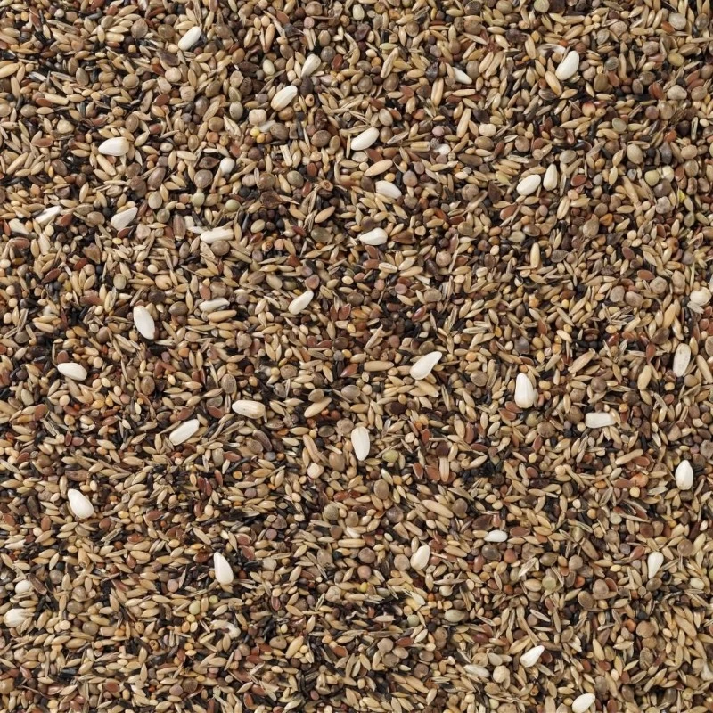Alpistes 29%, niger 20%, graines de lin 10%, graines sauvages Beyers 8%, chanvre 8%, périlla brun 7%, avoine pelée 6%, cardi 3%,sarrasin 3%, graines d’épinard 2%, graines d’anis 1%, graines de radis 1%, graines de trèfle 1%, marien chardon 1%