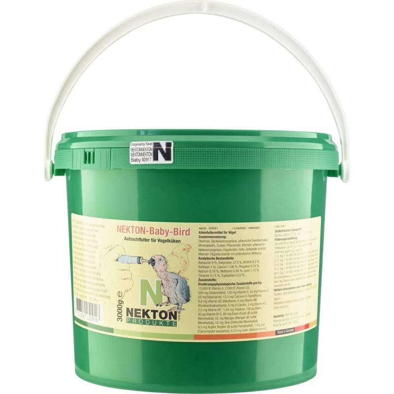 Nekton-Baby-Bird est un aliment complet pour nourrir les jeunes oiseaux à la main. Il a été soigneusement formulé avec des quantités importantes d’éléments nutritifs à base de légumes, en assurant le bon développement du système circulatoire, les organes internes, le système immunitaire, et des articulations. Probiotiques et prébiotiques sont présents pour promouvoir le développement de la flore intestinale, ainsi que l’aide à la digestion. Nekton-Baby-Bird doit être donné dès le premier jour jusqu’à ce que l’oiseau soit sevré; aucun autre aliment est nécessaire.