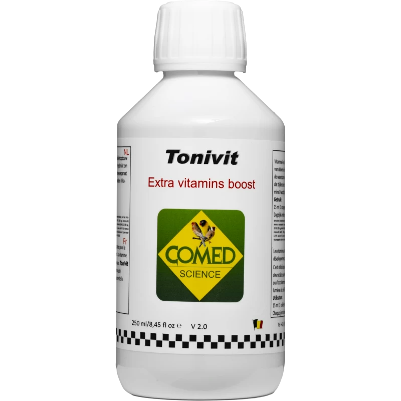 Tonivit, contient les vitamines A et D. Ces vitamines sont importantes pour la formation du squelette et la vitamine C pour la résistance des jeunes oiseaux contre les infections. Donner Tonivit pendant les périodes de faible luminosité.