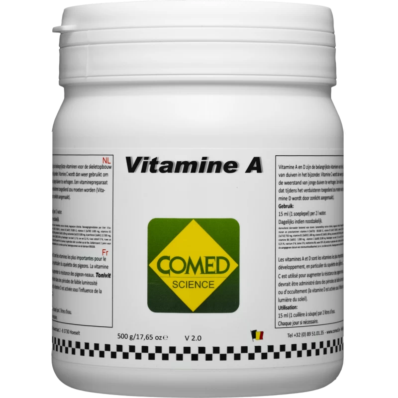 Suite à la nouvelle réglementation européenne les additifs, comme par exemple la Vitamine A, ne peuvent plus être vendus tels quels au consommateur final. C’est pour cette raison que Comed propose un nouveau complément alimentaire avec 1% de vitamine A (10.000.000 I.E.).